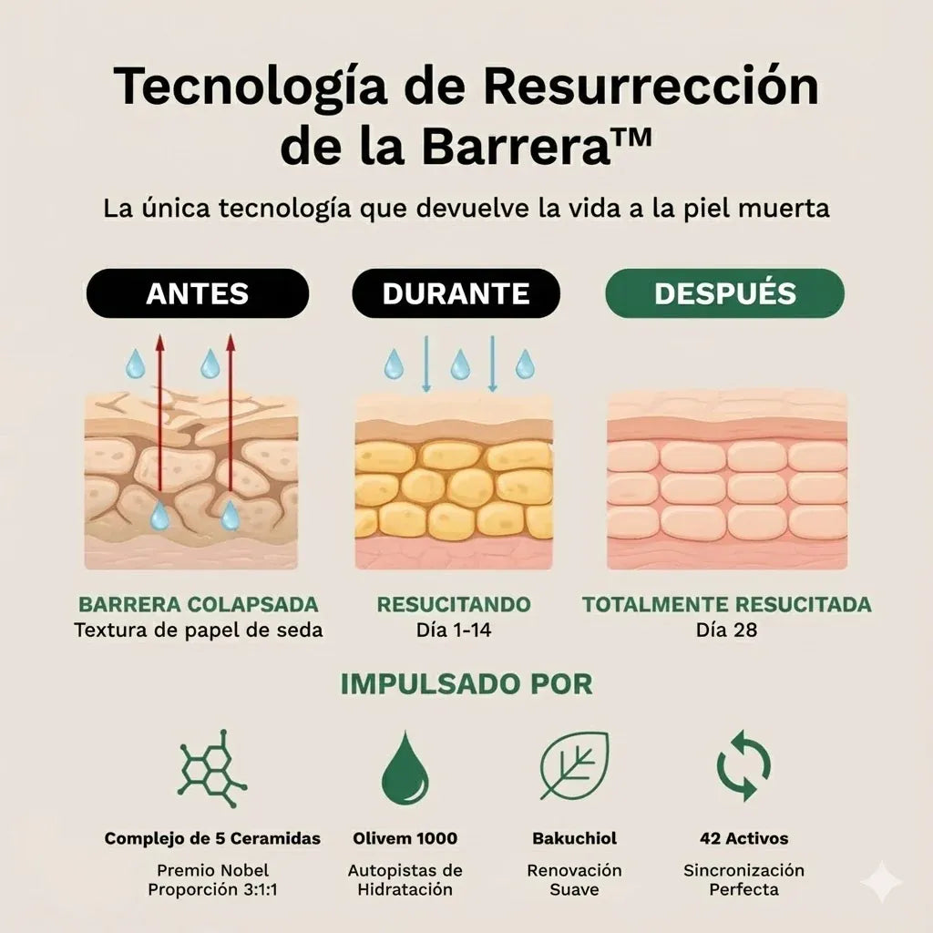 - Complejo de ceramidas (NP, AP, EOP) : reemplaza los lípidos exactos que la piel pierde después de los 50 años y está comprobado que restaura la función de barrera en 4 semanas.